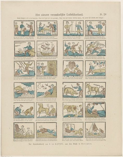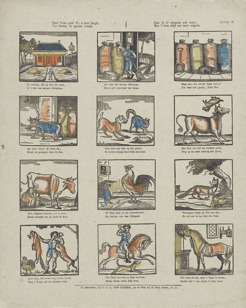 Franciscus Antonius Beersmans created this print titled "Verschillende afbeeldingen / Differents dessins." The work is composed of a grid of images, each one bordered with a thin black line. These frames create a rhythmic structure across the sheet, organizing diverse subjects into a unified field. The figures within each frame are colored with a limited palette, where blocks of red, green and yellow sit alongside the black lines, lending a graphic, almost diagrammatic quality to the images. This reductive approach to form invites us to consider the semiotic function of the images. Rather than focusing on mimetic representation, the artist isolates basic forms. This encourages the viewer to decode what each image signifies as a sign, reflecting a broader interest in the structural underpinnings of visual language. The overall effect destabilizes fixed meanings, suggesting that visual representation is a system of signs that needs to be interpreted within a given cultural context.