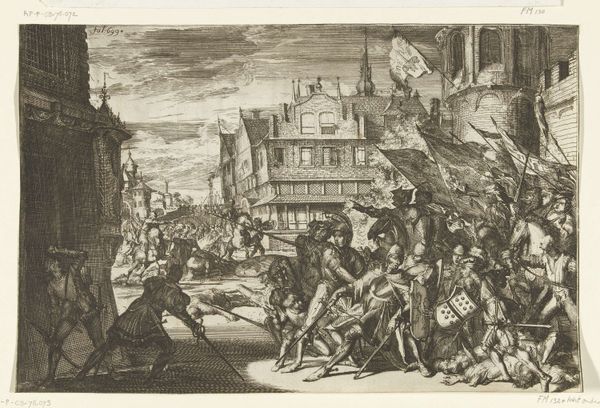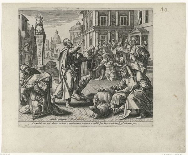 Editor: Adriaen Collaert's "The Parable of the Kingdom of Heaven" is a small, intricately detailed print. The contrast between the bustling foreground and the burning city in the distance is quite striking. What symbols do you see embedded within this image? Curator: The burning city often symbolizes purification or judgment. Consider the figure sowing seeds in the foreground— a powerful symbol, deeply rooted in religious and agricultural contexts, suggesting spiritual growth even amidst destruction. What continuities can you draw from this image to today's visual culture? Editor: I hadn't considered the sower in relation to the burning city. It gives a sense of hope amid chaos. Curator: Precisely. Visual symbols resonate across time. Understanding them unlocks deeper cultural meanings.