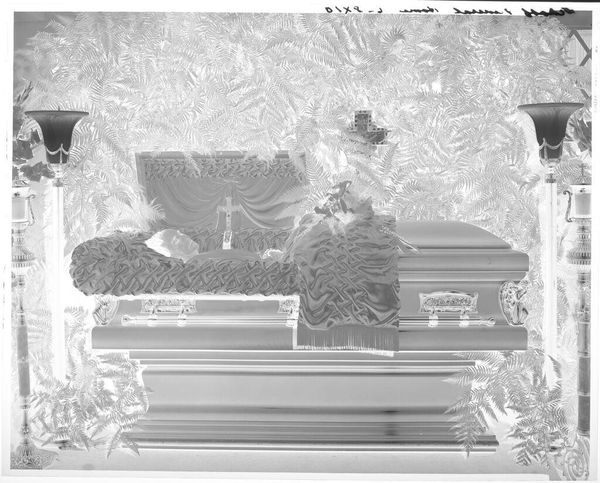 Curator: This silver gelatin print by Hamblin Studio captures a man lying in an open casket. Its small scale lends a surprising intimacy. What stands out to you initially? Editor: The stark contrast between the dark casket and the bright flowers creates a really jarring visual experience. It feels almost ghostly, like a memory fading away. Curator: The photograph was likely taken during a wake or funeral service. These images historically served as mourning tools and became integrated into personal and collective narratives around death. Editor: Considering the context of death and mourning, I wonder about the racial politics at play. Was this open casket a form of displaying dignity, a defiant act against societal erasure or violence? Curator: That's a critical point. The act of memorializing, especially within marginalized communities, often carries a powerful message of resistance. Editor: It makes you think about who gets to be remembered and how, doesn't it? Curator: Absolutely. Understanding its social history allows us to unpack its complexities. Editor: It's definitely a photograph that lingers in your mind.