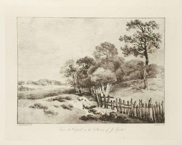 Curator: Here we have an etching by Thomas Gainsborough, dating from the late 18th century, housed here at the Tate. Editor: It feels melancholic. The trees, rendered with such fine lines, seem to droop, and the light is diffused. Curator: Notice how Gainsborough contrasts the densely worked foliage on the left with the more open, airy depiction of the right side of the composition, creating a sense of depth through tonal variation. Editor: Water often signifies the unconscious mind. Its stillness here, almost mirroring the scene above, creates a dreamlike quality, reflecting themes of introspection. The cottage in the background almost fades into the foliage. Curator: Precisely, and it's through such calculated compositional choices that Gainsborough elevates a simple landscape into something quite evocative. Editor: Yes, a visual poem indeed. I’m left contemplating how nature reflects our inner states.