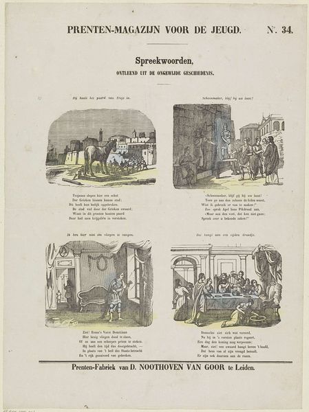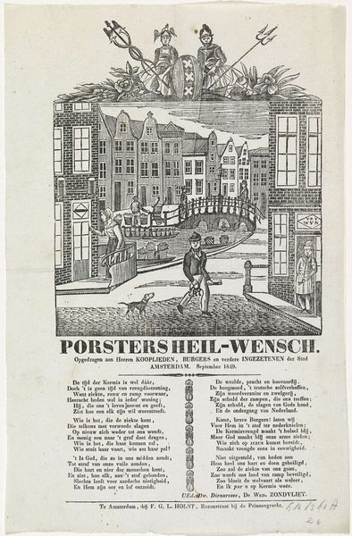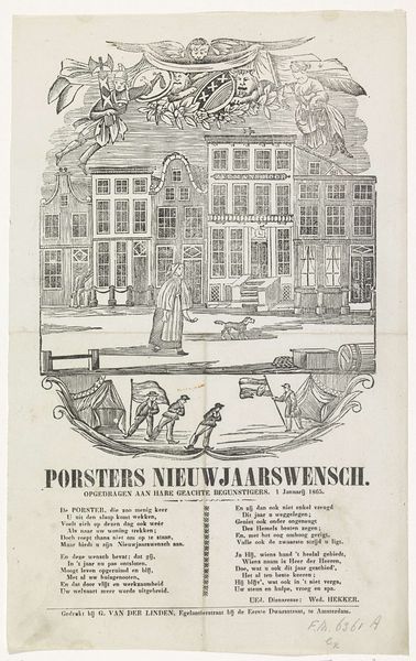 Curator: Immediately, I'm drawn to the sense of bustle and life. It's a simple scene, almost folksy, but brimming with implied narratives. Editor: Indeed. What strikes me is its combination of city plan and poetic dedication. Here in the Rijksmuseum, we have an anonymous piece called "Kermisprent van de Amsterdamse porsters voor het jaar 1865", dating from that year, of course. Curator: Porsters? The word itself sings! I picture ale-soaked gatherings, merchants vying for attention. I mean, look at the little dog trotting along – even he has purpose. Editor: A "kermisprent" was a kind of fairground print. This one seems a specific dedication to the "porsters", or peddlers of Amsterdam, offered with respect to their patrons in 1865. It is a very particular wish for their fair, composed in verse below. Notice the Amsterdam coat of arms above the sketched city, the figures almost protectors or even guardians. Curator: Oh, like little patron saints of the marketplace. But even without knowing all the specifics, I connect with the atmosphere: the anticipation of festivities. It's amazing that such a simple image can evoke such a strong sense of place and time. I can imagine what Amsterdam looked like then. Editor: And what the community life must have been like, very probably shaped by such yearly traditions. Note the wordplay, the references to pleasure and plenty, essential wishes intertwined with that coat of arms which adds to the sense of communal identity and shared hopes. The artist definitely understands how images and text can reinforce each other. The style has its charm. Curator: Precisely. It feels immediate, intimate, and hand-wrought, despite likely being reproduced. You almost smell the sweets baking, and hear the shouts of merchants. I am taken there. It shows a certain kind of social bonding too. Editor: Perhaps that's its genius – taking something potentially mundane and investing it with cultural meaning. A testament to the power of art in everyday life. Curator: A reminder, that beauty lies often within simple moments seen with appreciative eyes. Editor: A toast then, to the peddlers, the patrons, and the enduring charm of Amsterdam's streets.