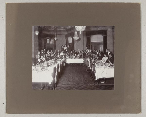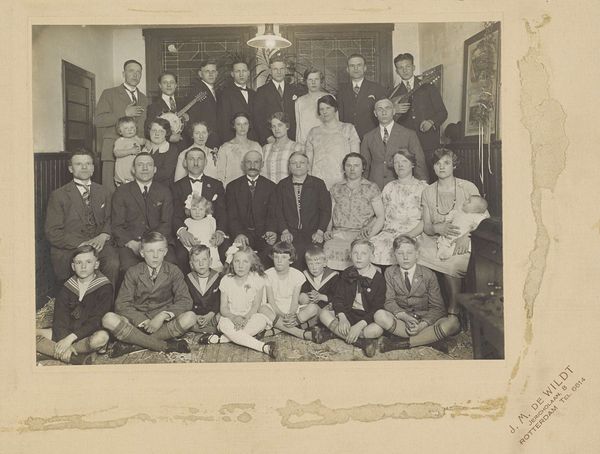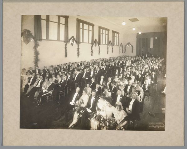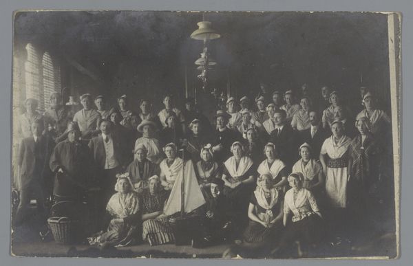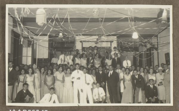 Editor: This photograph, "Groepsportret van leerlingen van de MTS te Haarlem," possibly taken in 1936 by Fotobureau Stevens, depicts a large group of people. The tones are all variations on gray, of course, as a black-and-white photograph. It's very formal and, even though they are a group, somewhat rigid. How should we interpret the structural components within this work? Curator: Let us first observe the deployment of subjects within the picture frame. The arrangement, predominantly frontal, generates a somewhat planar effect, yes? The stark uniformity in dress across most figures sets up a recurring visual rhythm. Note also the geometric structuring: the horizontal tiers and subtle symmetry which, taken together, underscore a desire for order and control. What, then, does this formal composition communicate? Editor: It feels very deliberate, not candid at all. Almost like a stage tableau, or a sculptural grouping, even, with that stepped effect. I suppose the formality reinforces that sense of control. Curator: Precisely. Reflect, now, on the use of light. Notice how it delineates forms and textures. The contrasts of dark suits and light dresses create tonal variations. The background curtains function almost as a foil, yes? By what means, do you believe, does such strategic lighting contribute to the work’s effect? Editor: I see now, the light not only differentiates textures in a stark tonal spectrum, but reinforces this ordered presentation in the way it illuminates their faces. It makes you notice each individual within the group and also brings the fore closer, highlighting them more than those towards the back. Curator: It indeed underscores their status within the composition. So, considering these aspects – arrangement, lighting, tonality – we witness how formal elements converge to manufacture meaning. A photograph it may be, yet rigorously organized per its presentation as a unified social group. Editor: Fascinating. Focusing on form truly reveals hidden facets. I now grasp how technical aspects communicate effectively. Curator: Indeed. Attending to structure sharpens our perception and illuminates implicit meanings.