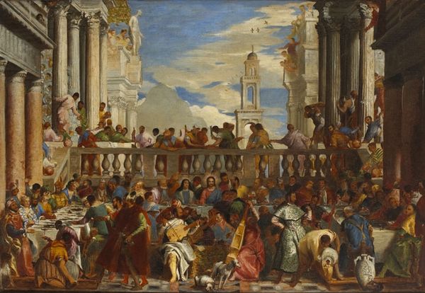 Curator: Immediately, the vastness overwhelms me. It’s a vibrant, almost chaotic scene. The figures seem crammed into the space, yet there’s an undeniable sense of celebratory energy. Editor: This monumental oil painting is "The Wedding at Cana" by Paolo Veronese, created in 1562. What you're sensing is quintessential Venetian painting – grandeur on a massive scale with incredibly vivid color. Veronese has masterfully depicted the biblical scene of Jesus turning water into wine at a wedding feast. Curator: Indeed, the compositional structure is remarkably adept at corralling such a multitude of forms. The architecture, especially the classical columns and statuary, provide a sort of scaffolding that the eye can navigate. I wonder, though, about the seeming anachronisms. Editor: The context here is everything. Veronese situates this biblical narrative within a contemporary Venetian setting, teeming with portraits of nobility, musicians, and even himself! It speaks volumes about the powerful families commissioning these works. It places them at the center of sacred stories and classical splendor. It wasn't just about devotion; it was about status, patronage, and the assertion of Venice's cultural dominance. Curator: Interesting. But observe how the painting is stratified. The upper reaches populated by smaller figures on balconies and levels. These vertical lines serve to heighten the visual drama, amplifying the scene's dynamism, and yet also contributing to the overwhelming impression you had, to its initial...crowdedness. It uses color not just realistically but symbolically; notice the way vermilion draws attention amidst paler colors; what that says? Editor: You're right. Veronese wasn’t slavishly devoted to realism. The scale of the painting itself, and these small but potent applications of vibrant colour point toward something deliberately performative; it serves as a sort of visual rhetoric that speaks to Venetian ambition, not literal depiction. Curator: So the artwork becomes almost a form of…propaganda? Is that too strong a word? Editor: Perhaps a *bit* strong, but certainly, it played a role in constructing Venice's image of wealth, piety, and sophistication, solidifying the established socio-political order. Curator: A visual symphony composed for the ears of power, as it were. Thank you for unlocking such nuances. I see so much more than I initially recognized. Editor: And through our exchange, I am also able to grasp some other subtleties that would otherwise have eluded me. A fruitful meeting of the minds, indeed.