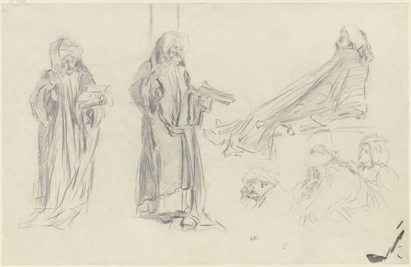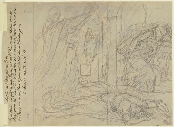 Curator: This sketch by Joakim Skovgaard, made with pencil on paper around 1895-1896, is called "Opstandelsen," meaning "Resurrection." It resides at the Statens Museum for Kunst. Editor: It has such a light, airy feel despite the gravitas of the subject! It's almost dreamlike with these faint outlines of figures. Curator: Indeed, the pencil strokes almost evaporate on the page. Skovgaard was deeply embedded in the cultural moment of national romanticism and sought to use biblical narratives to express something universal about the Danish soul. Editor: Well, resurrection, across cultures, represents rebirth, renewal… Is it fair to say the figure in the middle with that distinctive halo, coming out of some enclosure, depicts Jesus? And an angel, too? Curator: Precisely. Iconographically, we see classic symbolism – the halo as divine light and the angel gesturing perhaps as a witness or herald of this momentous occasion. The very faintness gives it, dare I say, a kind of democratic appeal in a time of monarchy. Editor: I see the historical reading! To me, this speaks about personal hope. This wispy Jesus ascending hints at the Christian belief that transcends a moment in history and exists in our cultural psyche even today. The figures seem almost archetypal. Curator: Perhaps Skovgaard intended to subtly imbue national identity through religious narrative, which became politically resonant and helped build support during times of war in Denmark’s modern history. The placement in the national museum amplifies this effect even today. Editor: Fascinating how the ethereal rendering underscores not only the spiritual event but its lasting symbolic impact. It also softens, ever so gently, the harder religious narrative we're so familiar with. Curator: This piece then serves as an artifact but, furthermore, shows us that the church became so closely intertwined with the state through its ability to rally national morale during great social and political turmoil. Editor: Beautiful. From personal to political, Skovgaard really gives the cultural imagination free rein.