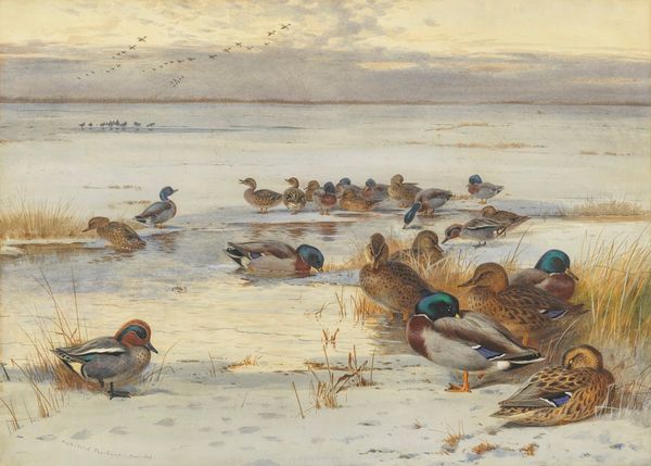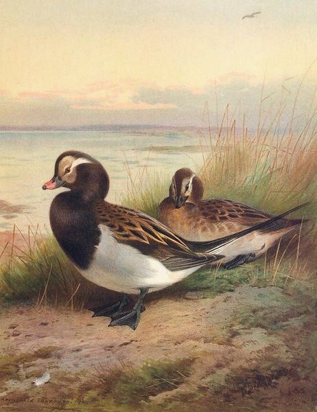 Archibald Thorburn made this watercolour called Pintail, Teal and Wigeon, On The Seashore sometime during his lifetime, right up to 1935. Look at the way the watercolor almost melts into the paper! He’s using a wet on wet technique, which means he’s applying the colours while the paper is still damp, allowing the pigments to flow and blend into one another, creating soft, diffused edges. This helps create a kind of hazy atmosphere, especially when you look at the background. Up close, you can see all these subtle variations in tone. Like, on the bird right in the foreground, see how he uses these tiny strokes of red and brown to give the feathers depth? It’s as if he’s almost building up these tiny textures, mimicking the real surface of the bird’s feathers. Thorburn's work reminds me a little of John James Audubon, who was another artist with a love for birds. But while Audubon was all about scientific accuracy, Thorburn seems more interested in capturing the mood and atmosphere of the natural world.