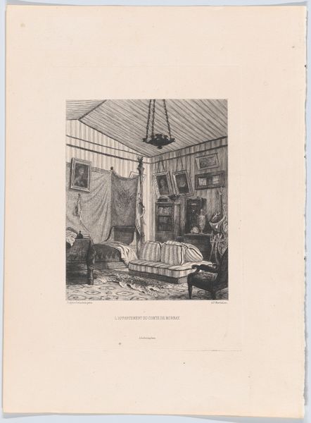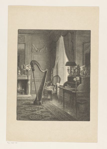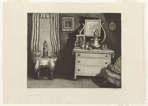 Curator: Here we have "Interieur met leunstoel, bij lamplicht", or Interior with armchair, by lamplight. It's a pen drawing or print from between 1880 and 1936 by René Janssens. It is a domestic genre scene currently held at the Rijksmuseum. Editor: Oh, I like the quiet mood of this piece. There's an armchair in the foreground. A warm light emanating from a lamp on a nearby chest. It's intimate and calm. Like someone's waiting for you. Curator: I agree. The choice of subject reflects the prevailing interest in domestic scenes characteristic of realist art of the late 19th and early 20th centuries. But what do you think of its historical importance? Editor: Well, in contrast with grand narratives favored by the academies, these artists looked at commonplace people and scenes, right? But what captivates me is how a simple, personal scene such as this reflects wider social and cultural dynamics regarding privacy, class and interiority during that period. This picture seems both nostalgic and quietly charged. What I think would be the role of the depicted space to provide comfort and an assertion of domesticity. Curator: I see your point. We should also point out the artist's skillful use of shading and line work to evoke a certain atmosphere. Editor: Totally, and I believe, these weren't only artistic decisions, but also decisions rooted in the available resources and opportunities the artist had within their milieu, considering material, socio-economic factors that informed their production of the artwork. I find it truly captivating. Curator: Thank you. Editor: Sure. Thanks to you.