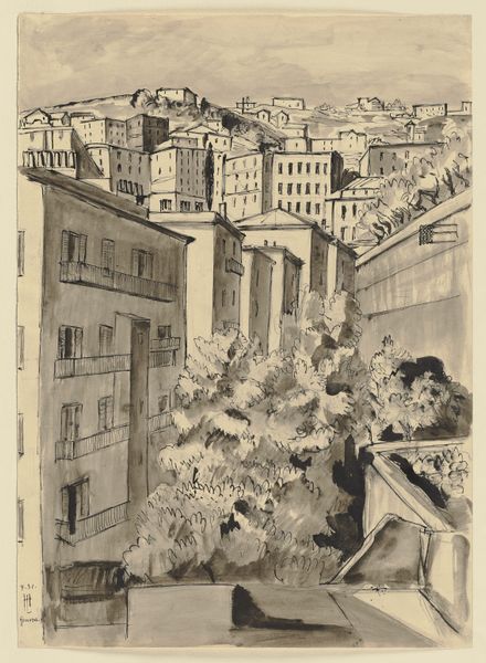 Walter Gramatté created 'Avenue De La Grande-Armée' using watercolor, with fluid brushstrokes and muted tones that evoke a dreamlike, almost ethereal quality. The composition is structured around the famous Arc de Triomphe, rendered in soft grays, which acts as a central anchor amidst the bustling Parisian avenue. Gramatté's approach appears to destabilize traditional perspective. By layering semi-transparent washes, he blurs the boundaries between foreground and background, suggesting a fluid, interconnected urban space. The bare trees lining the avenue are depicted with quick, calligraphic lines, hinting at the city's underlying structure. The color palette, dominated by grays, greens, and blues, creates a sense of melancholy. The painting functions as an exploration of modern urban life, challenging fixed notions of space and perspective. Its semiotic system, encoded in the brushstrokes and compositional choices, invites ongoing interpretations and acknowledges the fluidity of meaning in art.