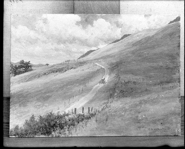 Editor: This sketch is by David Young Cameron and it's titled "The Deep Valley". I'm really drawn to how the light seems to fall on the distant cliffs, giving the whole scene a quiet, contemplative feel. What do you see in this piece? Curator: It whispers of the sublime, doesn't it? Cameron's masterful use of light and shadow transforms a simple valley into something almost otherworldly. Notice how the dark foreground guides your eye, almost like a path, towards that luminous, ethereal peak. It's as if he's inviting us on a spiritual journey. Editor: I hadn't thought of it as a spiritual journey, more of a scenic vista. Curator: Perhaps it's both! It’s the tension between the grounded and the transcendent that I find so captivating. It reminds me of how we often search for meaning in the grand landscapes of life. What do you take away now? Editor: It makes me think about finding beauty in unexpected places. Curator: Precisely! Art, much like life, often reveals its deepest secrets in the quietest moments.