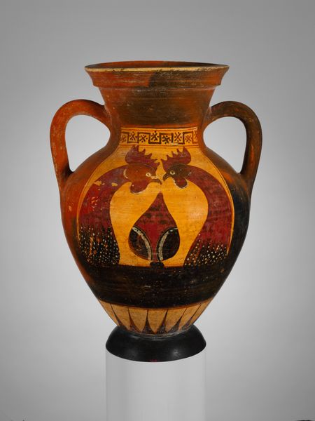 Editor: This is a terracotta psykter, or wine cooler, created around 520 BC by Oltos. I'm struck by the stark contrast between the black background and the orange figures. What can you tell me about its artistic structure? Curator: Notice how the shape of the vase itself, with its rounded belly and stemmed base, creates two distinct registers, one for viewing, the other for support. Consider, too, the painterly distribution of figures; how the curves of the dolphins mirror the vase's own contours, setting up visual rhymes. The application of glaze reveals sophisticated control, does it not? Editor: It does, I see what you mean. How does the artist maintain balance with so few colours and forms? Curator: Oltos establishes equilibrium through repetition. See the identical figures in their bilateral arrangement; they are each echoes. Furthermore, observe how the circular shields and vase's body resolve into repeating spheres. Can you imagine if it was done differently? Editor: If the figures weren't balanced and repeated like that, I imagine the whole thing would feel chaotic, even unstable, with all that negative space around the images. It's also amazing how something functional can also be a complete aesthetic statement. Curator: Precisely. Oltos transcends utility. We come to see not just a container, but a demonstration of aesthetic ordering. Editor: This has been fascinating; looking at it in terms of shape and repetition has really changed my perspective. I will remember that during my next studio art projects. Curator: And for me, a reminder that the humblest object may reflect art's deepest principles of balance, contrast, and visual rhyme.