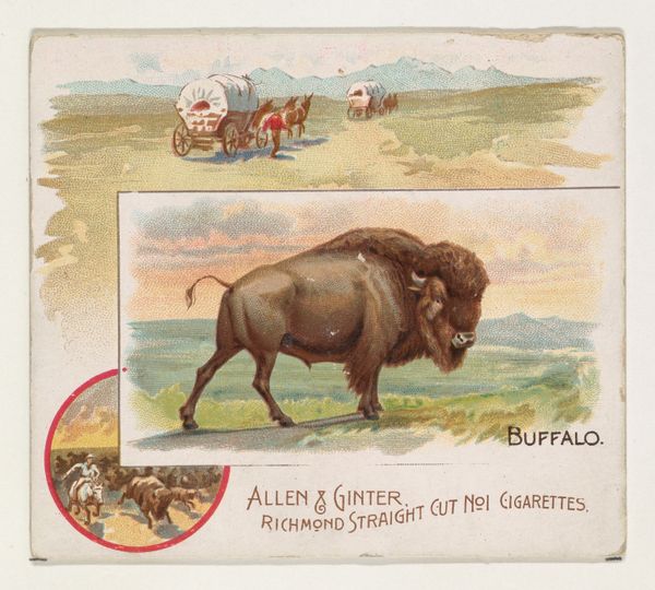 Editor: This is "Gnu, from Quadrupeds series (N41) for Allen & Ginter Cigarettes" from 1890. It’s a print that combines drawing and watercolour. It reminds me of an old postcard, with an odd juxtaposition of images. How do you interpret the cultural significance of this image? Curator: The imagery here reveals a fascinating intersection of commercialism and cultural curiosity. This small card was included in cigarette packs, part of a larger series depicting exotic animals, meant to be collected and traded. Look closely at the division; above, the gnu, a relatively unknown animal to Western audiences at the time, represents untamed Africa. Below, the figure with the spear implies an active presence in that untamed place. What does this positioning suggest to you? Editor: It feels like a clear hierarchy. The gnu is the spectacle, observed from a distance, and the human figure seems subjugated by the environment. Was this a common way of portraying these cultures at the time? Curator: Exactly. This reflects a broader trend of exoticization and, unfortunately, the reinforcement of colonial narratives. The image functions almost as a souvenir, a packaged piece of a far-off land easily consumed. It reduces a complex reality into simplified imagery, furthering the distance between the viewer and the subject. Does understanding its use as advertisement influence your view? Editor: Absolutely. Knowing it was meant to sell cigarettes really shifts my perspective. It makes me consider the underlying power dynamics and how easily these images can shape perceptions. Curator: Precisely. Symbols have the power to create cultural memory. This single card represents how a whole continent could be framed. Editor: It’s incredible how much history and ideology can be packed into something so small. It makes you question the visual narratives we consume today. Curator: Indeed. The symbols may change, but the power of the image persists.