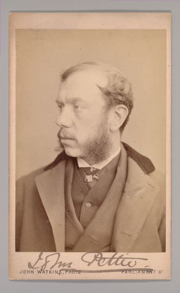 Curator: This albumen print, a photograph from the 1860s by John and Charles Watkins, is titled "[George Richmond]". Editor: It's incredibly subtle. The tones are so muted, it’s almost like a sepia dream. He seems lost in thought, peering into the middle distance as if reading tea leaves. Curator: Indeed. Albumen prints, popular then, use egg whites to bind the photographic chemicals to the paper, creating these lovely warm tones. It was quite a common portraiture medium, giving the rising middle classes a chance to immortalize themselves. Richmond, you’ll note, is shown in profile, a popular stylistic mode. Editor: And yet, there's a strange directness despite the profile. Maybe it’s in the intensity of his brow. He's got a very specific and almost severe look about him, don’t you think? A bit imposing? Curator: Victorian portraiture, in general, presented very deliberate poses to convey status, virtue, or intellect. Displaying oneself with confidence—almost severity—would’ve communicated respectability to the Victorian audience. A public image for consumption. The Watkins brothers themselves were known for photographing many members of parliament. Editor: Oh, you can absolutely tell! There's such care in his clothes. The lines of his jacket are soft, while the textures and contrasts hint at affluence, though done with British restraint. I'm just trying to imagine his story – who he loved, what he feared. He’s frozen in time and yet strangely present. Curator: And those carefully crafted details provided vital cues for Victorian viewers, telegraphing very specific messages about the sitter's position within society. Though that level of visual reading might be lost on a modern viewer at first glance. Editor: Perhaps. But maybe that stillness, that soft, almost dreamlike quality, lets us see past all that. It strips away the layers, revealing a sort of raw humanity— vulnerability, even. The overall effect softens the man while deepening his mystery. What a striking thing! Curator: I find it remarkable how these portraits serve both as reflections of an era and vessels of individual stories. A great example of photography becoming a new kind of social signifier in nineteenth-century Britain. Editor: Yeah, I was captivated by the texture. It’s soft and yielding. If he could talk now, what a tale he could tell of that now-distant, ever mysterious world.