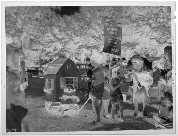 Curator: This is Francis Christophe’s photograph, "[Lyonel Feininger and three others on beach, Heringsdorf]". There's a casualness to it, yet something feels…staged? Editor: I feel a strong sense of theatricality, almost as if these figures are acting in a play. They are arranged in a very particular way on the stage, seemingly very self-aware. Curator: You picked up on "stage" too. The backdrop of the "Familien-Bad" sign, the deliberate poses…it feels like a performance of leisure, doesn't it? A commentary, perhaps? Editor: Definitely a performance! Notice how the swimmer stands, posed with hands on his hips, drawing our attention. His white bathing suit is reminiscent of Pierrot or a mime. Curator: And the others, more subdued, observing. The man in the hat looks almost like a director! It's fascinating how much narrative is packed into such a small space, just 8.2 by 14 cm. Editor: The image almost feels like a visual poem, doesn't it? Each element, from the bathing costume to the placement of figures, seems pregnant with potential meanings. Curator: Yes, it leaves you pondering not just what they’re doing, but why. It's an intriguing tableau, really, that stays with you. Editor: Absolutely. And I think that's part of its enduring appeal—this quiet invitation to decode its mysteries.