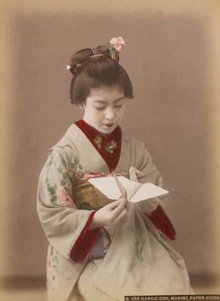 Curator: Welcome. We are standing before a vintage photograph, captured circa 1891 by the artist Tamamura Kozaburo. The piece is simply titled "Untitled," and it currently resides here at the Minneapolis Institute of Art. Editor: Ah, a ghostly glimpse into another time! There's something undeniably haunting and graceful about the scene. I feel like I've stumbled upon a memory, softened by age but still shimmering with the lives once lived. It feels quiet but theatrical, like a scene about to unfold. Curator: Indeed. This albumen print, with applied color, meticulously presents a formal composition of three women. Consider the subtle triangulation, anchoring our gaze across their stances and gestures. It’s realism with an elegant artifice. Editor: The hand-painted color really pops! Did they use it to highlight societal status or just for artistic flair? I get lost in the textures. Each pattern tells its own story, but collectively, they build up to more—it is a visual symphony. Curator: It serves both functions, I believe. Color enhances not only the aesthetic but also the semiotic value. Note, also, how it flirts with Japonisme, a movement reflecting Western enthusiasm for Japanese art. Editor: Oh, definitely. It makes me think about fleeting beauty and tradition. Do you think they knew their photo would last over a hundred years? I'm imagining what these ladies’ everyday lives might be, all of the secrets tucked into the folds of those kimono fabrics. Curator: That question leads us back to the tension inherent in genre painting. We have this carefully constructed image alluding to spontaneous daily life. Consider how the texture and sepia tones contribute. It evokes a tangible, archival feel, yes? Editor: Absolutely! I find myself craving some context to place myself in the scene. Like a haiku. Simple on the surface, but incredibly deep the more you look. Curator: I concur entirely. Through this “Untitled” work, Tamamura enables us to perceive not merely an image, but an echo of time. Editor: Precisely. Now I wonder what whispers future viewers might catch from our fleeting present?