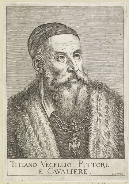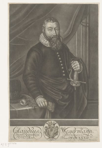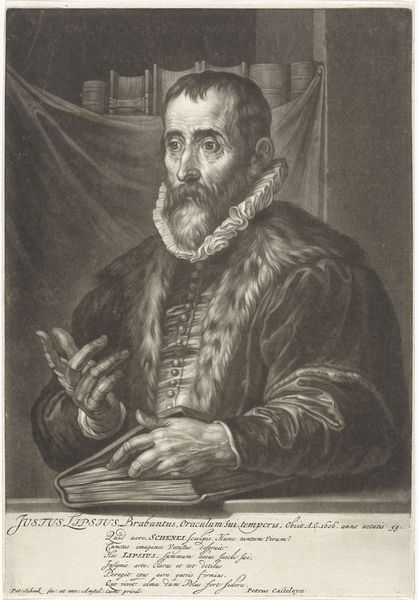 Curator: This engraving from 1682, residing here at the Rijksmuseum, offers a glimpse into the world of Justus Lipsius through the skilled hand of Edme de Boulonois. Editor: The portrait strikes me as surprisingly intimate for its time. The detail captures an inner thoughtfulness; you can almost feel the weight of scholarship. Curator: It's intriguing how the artist uses line and shadow to define not just form, but also character. The meticulous rendering of his fur-trimmed robe, contrasted with the etched backdrop, speaks to the sitter’s status. Editor: Absolutely. But beyond status, this portrait highlights intellectual life amidst burgeoning European anxieties surrounding the consolidation of power and religious reform. Lipsius’ furrowed brow hints at his struggles. We're witnessing a negotiation of identity. Curator: His attire suggests wealth, yet Boulonois deliberately contrasts it with the simplicity of his scholarly accoutrements. It speaks of a humanism, placing mind and knowledge at the center, visualized in compositional space as a key point of intersection. The gaze also invites direct engagement with the viewer. Editor: Indeed, his book anchors the lower portion and forms the physical grounding of this man’s place in society. His upturned hand could signal teaching, sharing the insights that are now immortalized, almost a calling to rise and be part of historical processes. I find myself curious as to the level of social mobility he might have afforded, or was trying to signal with his intellectual activity, or trying to escape... Curator: A powerful interplay indeed. Ultimately, Boulonois delivers not just a portrait, but a structured articulation of Baroque visual vocabulary. Editor: And for me, a starting point for engaging with the complex cultural currents running through 17th-century Europe and its impact on scholarship to this day.
