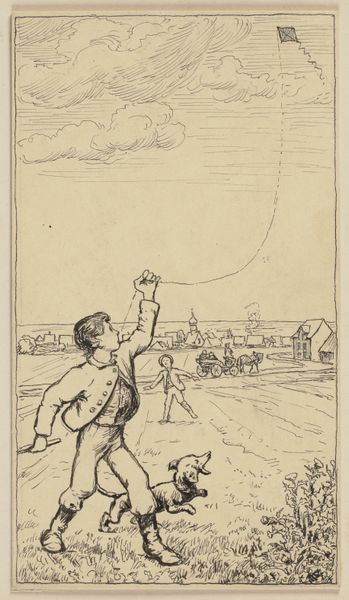 Curator: Gust van de Wall Perné created this work, titled "Jongen met etenswaren en hond," or "Boy with Food and Dog," between 1887 and 1911. It's an ink drawing on paper, currently held here at the Rijksmuseum. Editor: My first impression is that it looks like a preliminary sketch, quite spontaneous. There's a sense of playfulness and dynamism—especially the boy's strange form and the dog jumping at something we can't see. Curator: The context of the time is quite important. Perné worked during a period when there was growing interest in depictions of everyday life, moving away from academic formality. One could see this genre painting as influenced by that movement, where artists explored modern experiences and social observations. Editor: Right, and looking closely, you can see it's less about polished realism and more about conveying energy through minimal means. Notice the quick, almost nervous lines, which speak to its origin as perhaps sketchbook experimentation. Also, those lines wafting upward. What is the artist getting at with that effect? Curator: It definitely captures a fleeting moment. The drawing style reflects the accessibility and growing demand for easily reproducible images—prints and illustrations became increasingly common. This made art accessible to a broader public, far removed from only aristocratic consumers. Editor: Interesting point about accessibility. I see how Perné's deliberate stylistic choice affects the materiality of the work. I am especially interested in what is implied about social classes—such detailed care put into what most artists would discard as preparatory exercises. He’s treating a low or common subject with the highest esteem. Curator: Exactly! The artist presents an informal, intimate perspective on everyday existence. This work reflects how societal values and artistic themes began shifting around the turn of the century. It invites contemplation about how art could connect with daily life and resonate with an expanding audience. Editor: Well, Perné’s process-oriented approach gives insight into the burgeoning importance of not only what an artist makes but how and from what materials the artist brings art into existence. Curator: Indeed, it allows us a glimpse into the creative and cultural climate that embraced informal styles, focusing attention on often overlooked realities and perspectives. Thank you for the fresh, unique reading of the image! Editor: Likewise. Appreciating the piece within a material context helped flesh out the social underpinnings and what such a focus represents.