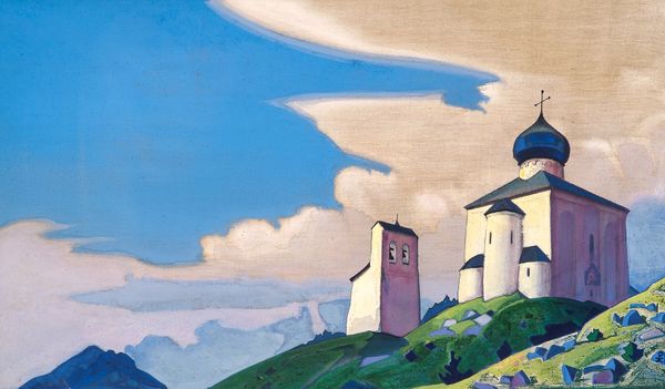 Editor: This is Nicholas Roerich's 1932 tempera painting, "Om mani padme hum", currently residing at the Latvian National Museum of Art. It's... serene. The pastels are calming, but there's also something imposing about the mountains looming in the background. What do you see in this piece, beyond the pretty landscape? Curator: Oh, much more than just pretty, darling! For me, Roerich captures a yearning, a whisper of ancient wisdom echoing through the Himalayas. It’s like he's painting a spiritual portal. The muted colors, that very specific shade of lilac...it evokes a feeling of transcendental peace. It invites you into contemplation. Editor: A portal, really? Curator: Absolutely! Roerich was deeply invested in theosophy, in bridging Eastern and Western spirituality. This isn’t just a mountain range; it's a landscape of the soul. Notice the strategic placement of the buildings against the peaks. The mountains *become* temples. They represent something eternal. It invites viewers to explore something higher, perhaps? Have you ever felt that deep connection to the landscape? Editor: I guess I never thought of it like that, but I suppose there *is* a kind of power that landscape possesses, whether its symbolic or real. The spiritual thing is new for me. Curator: That's the magic, isn’t it? Art opening up new pathways to connect with something profound. Maybe we're all just tiny temples nestled in the landscape of something greater. Editor: A good note to end on. Thanks! I'll never see pastels quite the same way again.