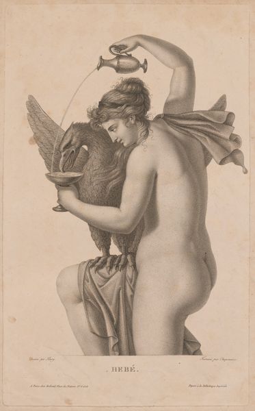 Editor: Here we have Émile Lassalle's "Leda en de Zwaan" from 1859, a drawing held at the Rijksmuseum. There's a stillness to this piece, a delicate quality in the light pencil work. The figures, especially Leda, feel very present and solid compared to the surrounding hazy, wooded landscape. What formal elements strike you most powerfully in this composition? Curator: Initially, the distribution of value is notable. Observe how the stark contrast between Leda's skin and the darker tones of the background generates a compelling figure-ground relationship, advancing her form into the viewer’s space. Additionally, Lassalle's strategic use of chiaroscuro amplifies the tactile presence of the swan. The balance here seems poised to topple -- what keeps it from doing so? Editor: Well, perhaps the line of Leda's arm across her waist subtly mirrors and visually balances the swan's raised wing, and the angle of her neck rhymes with that of the swan. Though the swan is lower, its form is quite assertive. But are you saying this could fall apart if, say, Leda was facing the opposite direction? Curator: Precisely. Consider how her contrapposto contributes a dynamic, curvilinear rhythm to the overall composition. A shift in her pose would disrupt this meticulously crafted equilibrium, potentially destabilizing the unity Lassalle achieved through such nuanced interplay of form. Do you see how Lassalle uses line in different ways to suggest roundness in the figure of Leda? Editor: Yes! Now I see it. Lassalle has a firm hand, with darker lines and cross-hatching to suggest the mass of the figure of Leda. Whereas he uses softer, smudgier, thinner lines to make the landscape recede into the distance behind her. It seems almost photographic. I’ve gained a new appreciation for the artistry just in the different types of line here. Curator: Indeed. A deeper exploration of Lassalle's formal choices reveals the underlying sophistication that defines the enduring allure of this piece. We see here a potent example of form contributing to meaning, don’t you think?