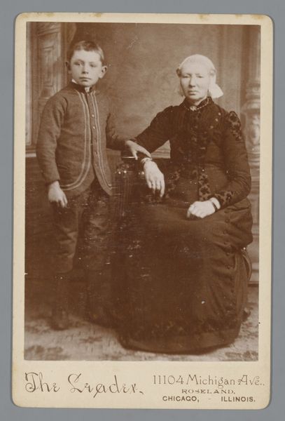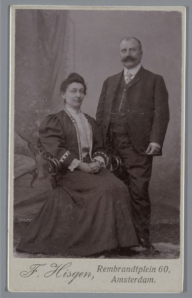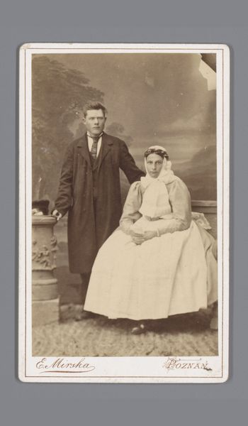 Curator: Look at this compelling gelatin silver print from the late 19th century—between 1868 and 1891, to be precise. The image offers us a 'Portret van een onbekende man en een onbekende vrouw’ by Veuve J. van Koningsveld. The details that have survived on this card mount! What springs to mind? Editor: Sepia shadows and starched respectability, primarily! It feels like peering into a window from a more regimented age, doesn't it? What survives on the fragile gelatin, I wonder. Are we sure about who owned Koningsveld's studio? I want to know about labor—about the price of materials and its role in this moment. Curator: You are correct! And indeed, a family studio, quite industrious in their portrait production, it would seem, but I find it moving—the backdrop's soft focus on idealized nature juxtaposed with their stiff poses, almost a contradiction, don't you think? As though yearning to transcend the rigidity of their social roles. Editor: Ah, but look closely! I see the production line right there, not nature, only an aesthetic that’s been strategically consumed and deployed. Consider also the gendered divisions here—the woman seated, submissive and dressed head to toe. Her husband stands and controls the gaze. The production of such images bolstered hierarchies that may not have otherwise appeared. Curator: And perhaps these two bought the fantasy this constructed gaze offered! Don't you think such family-run studios fulfilled a vital role within society as a mediator between dreams and their materialized representation? Editor: Mediation that reinforces structures! The materials speak volumes, from the gelatin to their clothes, the painted backdrop... all tools for maintaining control through aesthetic presentation. Curator: I find it so captivating, all of it together, though – those unspoken narratives etched into their solemn faces! It leaves room for contemplation beyond material analysis; maybe about lost loves and forgotten aspirations, hmm? Editor: Sure, but remember whose aspirations were recorded for posterity, and whose were systematically erased! Let's honor those voices still by contextualizing such imagery with production as a lens. Curator: All of the history contained within the tangible object does have something truly precious and sobering about it. Editor: To remember it can then offer the more meaningful insight.