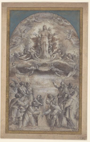 Editor: Here we have Avanzino Nucci’s “Dispute of the Holy Sacrament with the Trinity hovering in the sky,” dating from sometime between 1551 and 1629. It's an ink drawing. It strikes me as a really dynamic composition, almost bursting with figures in the earthly and heavenly realms. What do you see in this piece? Curator: I'm drawn to the insistent repetition of the circle and the ascending triangular forms. From the Eucharist at the center, a visual echo rises through the Dove of the Holy Spirit to finally resolve with God in the oculus. Do you see how Nucci uses this symbolism to create a visual pathway for the viewer? Editor: I do, now that you mention it. The Eucharist is literally and figuratively the foundation. So, the earthly debate is directly linked to the divine through these visual motifs. Curator: Exactly. The very idea of "holy orders" and the "great chain of being" are manifested in the spatial arrangements. Nucci also implies the importance of interpretation. Look at the figure taking notes on the lower left and the scholar surrounded by books at the center. Editor: It's like they're working out the divine word on Earth, or trying to. Are the faces symbolic in any way? Curator: The faces are all different ages and exhibit various levels of involvement in the titular dispute. Those clustered at the bottom, partially obscured, represent faithful observers, as they look upon those scholars working at revelation. Every character offers another interpretation. Consider also how this moment relates to the Catholic Reformation. Editor: That's fascinating! So, this drawing isn't just a representation of a theological debate; it’s a visual encoding of faith, knowledge, and power within the Church at a turbulent time. Curator: Precisely! Symbolism, then, gives form to ideological conflict. It reveals cultural anxieties of that time. Editor: This has given me a lot to think about. I had seen this as an illustration of a debate, but it's so much richer in its cultural context and symbolic density. Thank you!