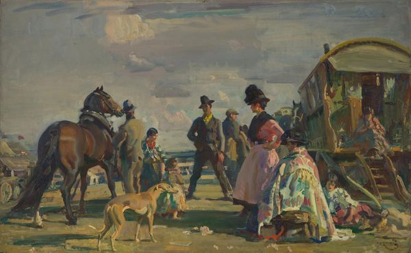 Editor: This is "Profile Portrait of a Boy with a Horse" by Denman Waldo Ross. The interplay between the boy and the horse feels very balanced. What do you see in the composition that stands out to you? Curator: The spatial arrangement is quite interesting. The artist uses a muted palette, predominantly earth tones, to create a sense of harmony. Notice how the verticality of the trees in the background counterbalances the diagonal line formed by the boy’s arm extending towards the horse. Editor: That’s a great point! It’s subtle, but it really brings everything together. Curator: Precisely. And consider the texture – the brushstrokes are visible, adding depth and movement. This emphasizes the materiality of the paint itself, drawing attention to the artist's technique. Editor: It's fascinating how much you can discern just from the formal elements! I'm gaining a new appreciation for this piece.
