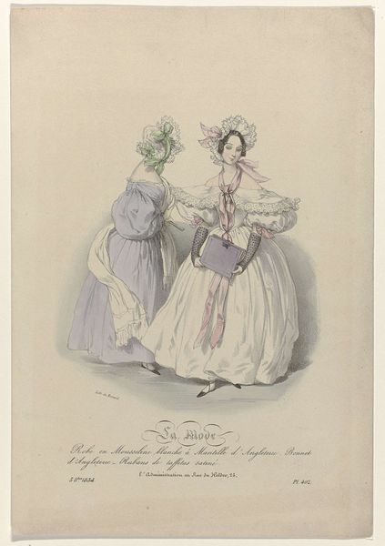 Editor: This lithograph with watercolor by Charles Philipon, "Autres tems autres (...)..modes 1800-1780-1824", seems to gently mock the changing fashions across those decades. It's whimsical and slightly absurd. What do you notice when you look at this piece? Curator: Well, for starters, isn’t it funny how fashion always seems to be looking backwards? Philipon's almost winking at us, suggesting the fleeting nature of trends. The clothing, for example, has these exaggerated ruffles and bows—almost like frosting gone wild. The pastel palette adds a certain delicate irony, doesn't it? A little sweetness to the satire. And those hairstyles? Don't they remind you a bit of piled-high meringues? What story do you think the artist wanted to tell? Editor: That's such a great observation about looking backwards and the meringue hairstyles! I guess he's saying that each era thinks its fashion is the pinnacle, even when it's kind of ridiculous? Curator: Exactly! It's a commentary that still rings true today. The absurdity of clinging to the 'now', only to cringe at it later. Plus, notice the subtle differences in posture. What could the artist be suggesting by showing us a profile view versus a woman who directly faces the audience? It gives them almost distinct personalities based on dress, doesn't it? Editor: It does, and almost makes the woman from 1780 seem shy or hidden, like fashions she embodies are almost embarrassed to be out of date. I didn’t initially notice that! Curator: And see how each garment's visual style impacts your immediate assumptions, or gut reactions, regarding who those women are? And ultimately... ourselves? Philipon prods at identity by making it transient and funny. Editor: Wow, it's like he’s saying, "Don’t take yourself too seriously, especially when it comes to what you’re wearing." That makes me see fashion in a totally new way. Thanks!