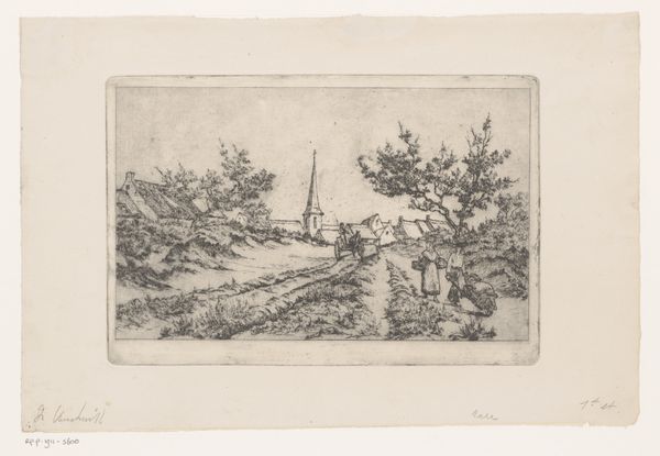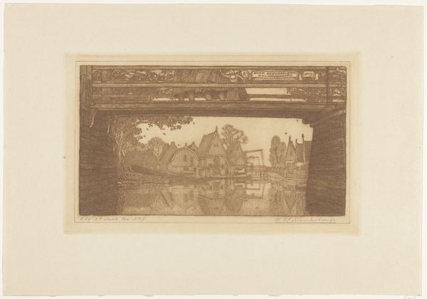 Curator: This subtle yet captivating work is entitled "De ophaalbrug Edam," or "The Drawbridge of Edam," tentatively dated to 1916, and crafted by Wijnand Otto Jan Nieuwenkamp. It’s an etching, ink on paper. What strikes you first about it? Editor: Well, immediately the intricate detail draws me in. The branches of the tree, for instance – each rendered with delicate lines, suggesting a quiet observation of nature and something of an invitation. Curator: That precision is characteristic of Nieuwenkamp's work. He was deeply involved with preserving traditional Dutch architectural subjects and scenes. He romanticized village life even when those ways were passing due to industrialization. This print reflects that cultural anxiety. Editor: There's a melancholic tone, isn't there? Bridges often represent transitions, connection, and the promise of new possibilities. But here, the raised drawbridge almost seems to act as a barrier. And with the old buildings on either side of the canal, one gets the feeling this place has become a time capsule. The symbols, however, are not all of despair. Water symbolizes unconsciousness and dreams, inviting the spectator to dream of the scene rather than walk through it. Curator: Precisely. In Nieuwenkamp's time, rural Dutch society experienced intense urban migration. The art of the era showed people actively wrestling with what would be lost or changed forever due to modernity. You could almost imagine he wasn’t just illustrating a bridge, but documenting the character of an entire epoch that would pass. Editor: It feels heavy with symbolism, then. Not just as a mere rendering of the physical world but as something deeper… a comment about a world on the verge of dramatic change, and perhaps even mourning the cultural world that modernity inevitably disrupts. It asks the question: What do we leave behind when we move towards the future? Curator: Exactly. We should be careful, I think, not to interpret this only through modern eyes. In some ways, prints like this served a functional purpose. Think of them as popular records of a shared cultural experience; or maybe ways to reflect on values from the past. Editor: Absolutely. Seeing these prints is also, in a way, participating in an act of cultural preservation. These symbols offer us insight into cultural memory and a vision of change. Curator: Indeed. Nieuwenkamp gives us more than just a visual of a bridge and a canal; he provides us with a view into the soul of a society. Editor: Thank you. Now I leave this place with the gentle melancholy of memory.