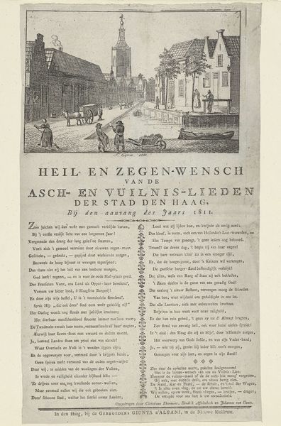 This is "Heilwens van de Amsterdamse opkorters", made in 1849 by an anonymous artist. This print wishes health to the people of Amsterdam. Created during a period of significant social and economic change, it provides a window into the lives of ordinary citizens. The image captures a street scene, illustrating everyday life and labor. The figures are portrayed engaged in common activities. But it's the text that really speaks to the cultural context. The print references the fear of cholera, a disease that disproportionately affected the poor and working class. This reveals anxieties about public health and social inequalities. It wishes that even if there is no feast, there is still joy in the house, and even if illness diminishes strength, may joy not be prevented by fear. The anonymous artist reflects the collective hopes and fears of a community grappling with disease and hardship, while yearning for prosperity.