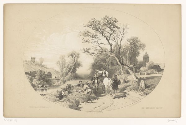 Curator: My first impression is one of village life captured with such quiet attention to detail, it feels almost like a glimpse into a forgotten memory. Editor: That’s beautifully put. We’re looking at “Uitgaan van de kerk,” or "Leaving the Church", an etching crafted between 1842 and 1843 by Charles Rochussen, currently held at the Rijksmuseum. Curator: Etching, right. Look how Rochussen manages to animate a whole community with a relatively simple medium. I'm drawn to how everyone is arranged into small, interconnected groups as they trickle out. You get the feeling that these aren't just anonymous figures. They have connections, their own little dramas brewing just outside the frame. Editor: The arrangement of figures definitely speaks to community. Notice how Rochussen places the church steeple almost dead center? It visually anchors the piece. Religious architecture often symbolizes a spiritual core. Here, the church seems less a place of solemn worship and more the beating heart of social interaction, everyone emerging renewed, perhaps? Curator: Oh, definitely a symbol! I wonder though, look at the sizes of people in relation to the houses…almost toylike. A whimsical take for Realism. To me, the real brilliance of this piece isn’t the grand spiritual statement, but how it gently, almost humorously, presents daily life, the way folks actually experienced church – social mingling. It's beautifully down to earth. Editor: I like your read. I see those quaint houses with thatched roofs, almost fairy-tale-like! Rochussen’s Realism is clearly imbued with the soft glow of Romanticism. He elevates these ordinary moments, suggesting they're worth pausing for. Curator: Makes you wonder what kind of conversations they're having as they leave the churchyard. Planning the week, sharing gossip… You start building whole narratives for them. Maybe Rochussen hoped we might imagine the rich humanity bubbling under those traditional costumes. Editor: It feels complete – these small figures contain complete worlds of social and emotional texture in what amounts to a beautifully rendered everyday scene. A reminder, perhaps, that history happens not only in grand battles and political maneuvers, but also in the quiet comings and goings of ordinary people from ordinary places.