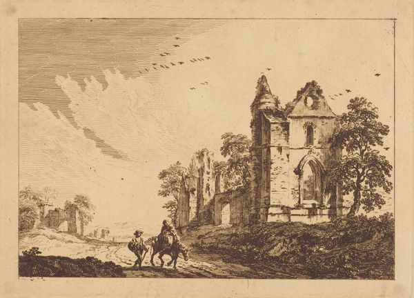 Editor: Here we have "Prometheus steelt het vuur na het boetseren van de mens", or "Prometheus Stealing Fire After Sculpting Man," an etching and engraving by Étienne Dupérac, created sometime between 1535 and 1604. The scene feels oddly detached, as if classical mythology and ruined architecture exist in separate spheres. What story do you see being told here? Curator: The brilliance of Dupérac here is less about illustrating a literal narrative and more about layering symbols of power and its transgression. Consider Prometheus, a Titan challenging Zeus' authority by gifting fire – knowledge, progress, rebellion – to humanity. Then look at the ruin. Editor: The ruined building, yes... Curator: It isn't just background. It represents the fall of empires, the ephemerality of earthly power. Dupérac might be hinting at a cyclical relationship between progress and decline, inherent in civilization itself. He's also very pointedly placing this mythical narrative *within* the context of a specific place, maybe Rome? Consider what happens when existing political structures – like that of 16th century Europe – are challenged by human curiosity, knowledge, enlightenment. Does the fire threaten existing institutions represented by this ruined structure? Editor: So, you’re saying it's a meditation on the dangers and potential inherent in challenging established power structures? The human cost *and* the creative possibilities? Curator: Precisely. Dupérac uses a classical myth not just as a story, but as a lens through which to examine his contemporary society and how power dynamics shift and shape our world. Editor: I see that contrast between the eternal narrative and the very real-world ruin much clearer now. Curator: That dynamic tension – between the timeless and the timely – makes Dupérac's print so resonant even centuries later.