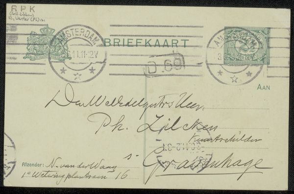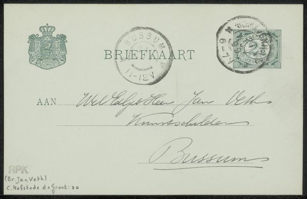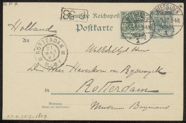 Curator: We're looking at "Briefkaart aan Philip Zilcken," a postcard possibly created around 1896 by Carel Nicolaas Storm van 's-Gravesande, housed here at the Rijksmuseum. It's rendered in pen and ink. My initial reaction is that the sender’s presence is strongly communicated here, both personal and immediate. Editor: Immediate is the right word. For me, the most striking thing is just how *ordinary* it is. This wasn’t designed as something to be appreciated in a frame. It served a purpose; it carried a message for a moment, likely composed very quickly in pen and ink. There’s a lack of pretense that makes it quite affecting. Curator: Precisely. The handwriting itself becomes a kind of symbolic expression. Note how the flourish of "Holland" at the top anchors the Dutch identity, yet it's mailed via "Deutsche Reichspost," signifying interconnectedness during that era. And the postal stamps themselves! Aren't they fascinating little emblems of bureaucratic control? Editor: Fascinating in how quotidian, maybe even bureaucratic is beautiful? Each stamp impression, the smudged ink, everything speaks to the transit of this card—its very tangible movement through systems of production, transport, and labour to end up wherever it did, and who was involved along the way. Curator: True, and in that vein, the act of writing is itself almost ceremonial, ritualistic, encoding a message that transcended the purely practical. Even now, it feels incredibly poignant. We see evidence here in the text of a commercial transaction, perhaps, but carried across the paper as though it had enormous human value and symbolic importance. Editor: Yes, but to go back to the stamps...They show the economic realities; the labor involved in processing mail, the industrial means to create stamps by the millions, that cross border commerce you mention... That's material culture right there on a little card! Curator: It truly makes you think of how our simplest means of communication embed layers of significance—economic, social, even spiritual. Editor: Absolutely. A beautiful reminder of art being embedded in everyday existence.