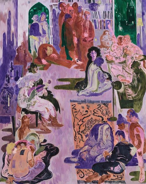 Editor: This is James Ensor's "The Despair of Pierrot," painted in 1910. It's an oil on canvas featuring Pierrot surrounded by masked figures. There's something unsettling about the scene; the joy of the carnival seems to mock Pierrot's sadness. How do you interpret this work, especially considering Ensor's focus on masks? Curator: Ensor's use of masks isn't merely aesthetic; it's a powerful commentary on societal roles and the performance of identity. Pierrot, the archetypal sad clown, is confronted by a chorus of grotesque figures. Consider the sociopolitical climate of early 20th-century Belgium: a rapidly changing society grappling with industrialization and class tensions. Could these masks represent the bourgeoisie, hiding behind facades of respectability while reveling in excess? What might Pierrot represent in opposition to this backdrop? Editor: That's a fascinating reading! I was focused on the personal despair, but the masks as a critique of societal hypocrisy makes a lot of sense. The exaggerated features and the almost aggressive joy contrast sharply with Pierrot’s muted sorrow. Curator: Exactly! Ensor uses the visual language of the grotesque to challenge the dominant power structures. Think about the concept of the "carnivalesque," where social hierarchies are temporarily inverted. Is Pierrot’s despair a rejection of this superficial inversion, a longing for genuine connection in a world of performative identities? The masks could therefore signify alienation and how social expectations and constructs can pressure us. How do you perceive his gaze amidst all these faces? Editor: It seems like he's looking inward, almost oblivious to the chaos around him, perhaps indicating the isolating nature of despair in a society obsessed with appearances. I see a contrast of private and collective emotions being juxtaposed. Curator: Precisely. This interplay between individual emotion and social critique is central to Ensor's work. Considering this social and historical context certainly enhances our interpretation. Thank you for considering such a multifaceted approach. Editor: Thank you! Thinking about the socio-political context gives me a completely new perspective on Ensor's intentions. I will certainly try to use similar interpretative approaches.