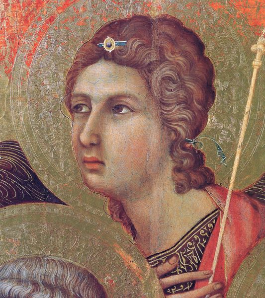 This fragment by Duccio, an Italian painter active in the late 13th and early 14th centuries, captures an angel in tempera and gold. The halo, a radiant disc behind the head, signifies divine light and spiritual power. The angel's delicate features and serene expression are hallmarks of Duccio's style, meant to inspire reverence and contemplation. Consider how the halo echoes the solar disc of ancient sun gods, a visual motif adopted by Christianity to denote sanctity. The red ribbon may be an early representation of secular power, in the form of a diadem, used for the highest ranks of nobility. This enduring symbol has appeared and reappeared across cultures and millennia, and its transformation reflects evolving beliefs and power structures. It’s a testament to humanity’s deep-seated need to visualize and embody the divine, a potent force that resonates even today.