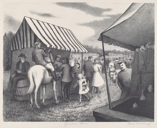 John Muench made this print, Country Fair-Night II, and I love the way he's built up this whole scene using just black and white. It's like he's feeling his way through the image, letting the tones emerge. The texture here is amazing; you can almost feel the rough paper and the way the ink sits on it. Look at how he's layered the marks to create depth, especially in the crowd. There's a real push and pull between the light and the dark, which gives the piece a kind of nervous energy. And then you've got these small details, like the ferris wheel lights in the background. It all adds up to a feeling of being right there, in the thick of it, at the fair. Muench's work reminds me a bit of Honoré Daumier's lithographs; both artists had an eye for capturing everyday life with a real sense of humor and humanity. Art’s all about that conversation, right?