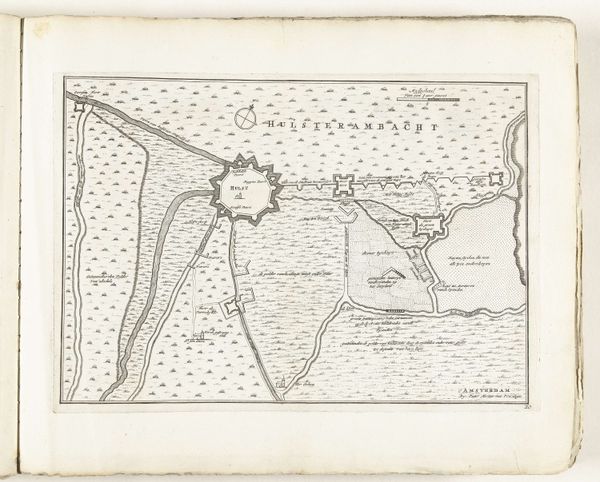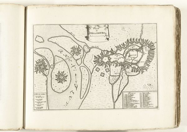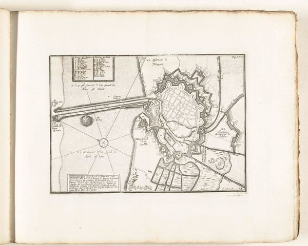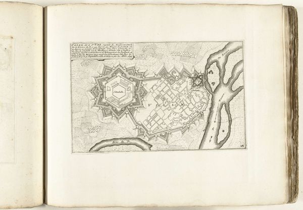 Editor: Here we have Jacobus Harrewijn's "Plattegrond van Condé," dating back to sometime between 1706 and 1712. It’s an ink and engraving print of a city, seemingly heavily fortified. It looks so precise and ordered. What's your take on this piece? Curator: Immediately, I’m drawn to the symbolic power of the city plan itself. Notice how Condé is depicted. The city as a fortress, right? The star shape, the sharp angles – they evoke defense, security. But against what? Consider the cultural memory embedded in these forms. Editor: A sense of protection then, from invasion maybe? Curator: Precisely! Think about the psychological impact of living within such a structure. Walls provide security but also imply confinement. The geometric layout could represent a rational, controlled society, pushing back against the chaos outside. Do you see any symbolic meaning embedded in the relation of the urban inside with the outside? Editor: I suppose the river could signify commerce or resources, but the marsh area named "Marais" sounds dangerous. Was Condé a strategically important place during its time? Curator: Exactly! It would have been a strategic and economic locus that shaped regional relations, and Harrewijn’s rendering emphasizes both the constructed defenses and the seemingly limitless openness of its territory. And yes, Marais carries the psychological weight of disease, wildness, the unknown. Editor: This piece has really given me a different perspective. Now I can see more in the design than I initially thought, as well as the city's memory within that. Curator: Seeing historical context is an invaluable method for unpacking meaning; and seeing the city itself as a symbol, loaded with intention, changes how we perceive the urban experience even today.