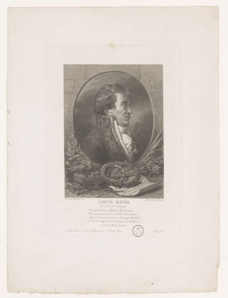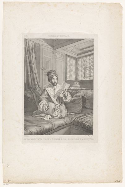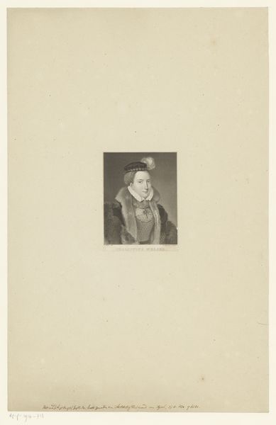 Editor: Right, so here we have “Portrait of Maria Carolina of Bourbon-Two Sicilies.” It’s a print, an engraving specifically, by Adolphe Philippe Noiret, sometime between 1815 and 1915. I’m really struck by how this seemingly domestic scene is cast with quite a solemn air. How do you interpret the symbolism embedded in a portrait like this? Art Historian: An intriguing question. It’s impossible to separate an image from its context. While it appears domestic, let’s consider what the map, the quill, and even the somber window evoke. Do they whisper of quiet intellectualism, or something more weighted, perhaps a longing for a world outside the confines of this room? The inclusion of religious imagery further complicates the visual language, doesn't it? Editor: You mean the crucifix hanging by the window? I hadn’t thought too deeply about it. So, you see it less as a simple depiction of nobility and more as... loaded? Art Historian: Precisely! Every object included would have carried potent associations for viewers. For instance, is the map simply a signifier of education, or a veiled reference to political landscapes, perhaps territories lost or yearned for? Even her posture projects authority, yet there is a softness to her gaze and setting that might denote subverted anxieties about power and position. Editor: I never thought of it that way before. I was focusing on the sitter herself, but I get that the objects function almost like characters. So each of the items included, would have meanings understood by everyone? Art Historian: Indeed. Consider the print not just as a likeness, but as a constructed narrative, employing symbolic language to communicate specific ideas about Maria Carolina, accessible to those familiar with the visual vocabulary of the time. Editor: Wow, I'll definitely look at portraits differently from now on! I can see how unpacking these visual cues makes the image so much richer.