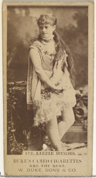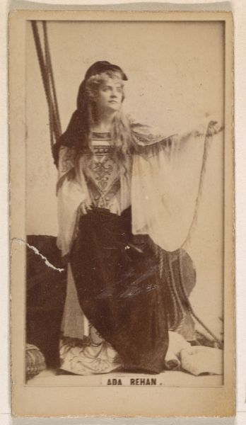 Editor: So this is “Adrian, from the Actors and Actresses series,” printed in the 1880s by W. Duke, Sons & Co. It's a small, sepia-toned card, most likely a promotional item. It gives off this romantic, theatrical vibe with her elaborate hair and costume. What strikes you most about this image? Curator: I see an echo of mythological figures, perhaps a pre-Raphaelite imagining of a woodland nymph or even a siren. Consider the cascade of her hair – doesn’t it feel like a deliberate reference to flowing water, a classical element often associated with feminine power and allure? What do you think is being sold beyond the cigarette brand? Editor: I see what you mean about the mythological vibe! And the commercial context is obvious from the inscription. But could her pose also be significant beyond just a "pretty picture" to sell cigarettes? Curator: Absolutely. Note the direction of her gaze, slightly averted yet inviting. It speaks to a calculated performance of femininity for the male gaze but also hinting at agency. In Victorian culture, hair, especially long hair, symbolized both sensuality and virtue. So the photograph operates on several symbolic levels. How does that impact the reception of the advertisement itself? Editor: That’s fascinating, considering it was a cigarette ad. So they're not just selling tobacco but also this image of idealized, almost mythical femininity...packaged with a known vice. That tension is pretty striking now that I think about it. Curator: Exactly! It is interesting to see how even in something as seemingly trivial as a cigarette card, complex cultural narratives are at play. Images carry significant weight; it makes one contemplate their power and reach. Editor: I’ll never look at an advertisement the same way again. The layers of meaning are really astounding.