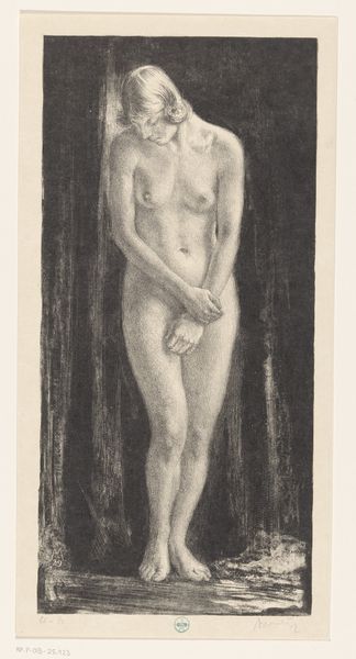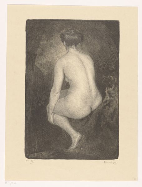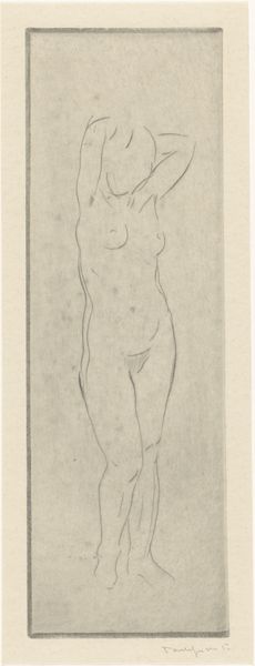 Curator: This etching, entitled "Naakte vrouw met hand op haar hoofd kijkend in een spiegel" or “Naked Woman with Hand on Her Head Looking in a Mirror", was created by Armand Rassenfosse sometime between 1872 and 1934. Editor: The earthy, reddish-brown tone gives it a really intimate feel. I’m struck by the subject's direct gaze, and the tactile sense of the medium. You can almost feel the texture of the paper, like aged leather. Curator: Absolutely. Rassenfosse was heavily influenced by Art Nouveau. He moved in those circles in Belgium, and there's a real sensuality present here, a departure from academic tradition. The work engages with new ways of representing women and their bodies. Editor: You can see it in the line work. It’s delicate but assertive, a contrast which is fascinating when you consider etching involves labor-intensive processes—dipping plates, acid baths. What a dance between the body, materials, and maker! Curator: Right, it would have been interesting to be a fly on the wall, in his studio while he produced the artwork! Beyond the Art Nouveau context, prints like these played a key role in disseminating imagery to a wider public beyond wealthy art patrons. What stories did this circulate, and for whom? Editor: That reminds me of all those questions about circulation and display: was this originally intended for private collections, or did Rassenfosse aim for broader public access? Curator: An interesting point to consider; he was very deliberate, and made choices. Given his association with Art Nouveau aesthetics and the emergent role of the artist in marketing luxury objects at the turn of the century, it could go either way! Editor: Looking at the materiality, and also thinking about his own commercial endeavors, he was likely quite aware of appealing to different audiences at once, almost bridging high art and popular aesthetics. Curator: Well, I’ve certainly got new questions to ponder after our brief discussion, regarding Rassenfosse’s strategy. Editor: Indeed! I appreciate how this work provokes consideration of not just the artistic choices, but also how materiality, labor, and distribution interact to create cultural value.
