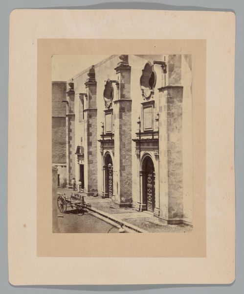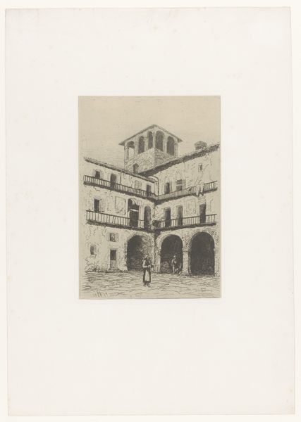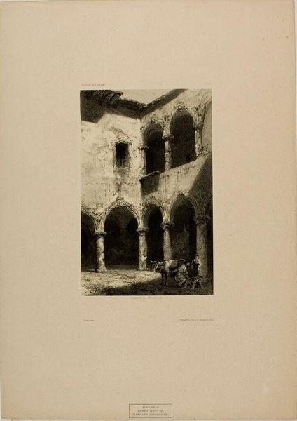 Curator: This is Alexandre Calame's etching, "Two Figures with a Donkey in a Courtyard," created between 1852 and 1855. Editor: The high contrast between the shadows and sunlight really emphasizes the building’s decay, creating a sense of melancholy or maybe just a deep acceptance. Curator: The architecture—those arches and columns—speaks of permanence and established structures, yet is softened somehow. Editor: Absolutely. The architecture provides this grand backdrop, almost like a stage set for the ordinary lives playing out. Look how the figures seem dwarfed by their environment. Are they romanticizing peasant life or highlighting economic disparity by portraying people in an almost theatrical state of dispossession? Curator: Consider how donkeys, historically, represent humility, patience, even stubbornness. They often carried symbolic burdens—literal and metaphorical—for communities. The pairing with the human figures seems to emphasize themes of labour and perhaps endurance. Editor: Yes, and donkeys have been historically used and abused—this composition feels pointed. What power dynamics are on display within this print, beyond the superficial tranquil pastoral image? We might also ask, who would the viewers of such images be and what did they think of them? Curator: Etchings, due to the acid-based process and materials like metal plates, connect to a historical alchemy. An ordinary scene transformed, even elevated, through symbolic artistic processes and mediums, gaining enduring power and cultural impact in its monochrome replication. Editor: You’re right, and that replication raises questions of accessibility, and to whom such representations appealed and why. It's this strange dance between capturing lived experiences and turning it into consumable imagery that holds my attention here. Thank you for helping me consider Calame's choices more deeply. Curator: And thank you for reminding me of the continuing relevancy in observing visual tradition within this work.