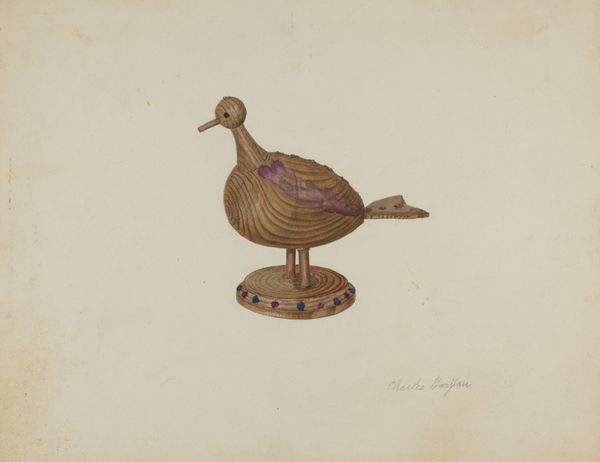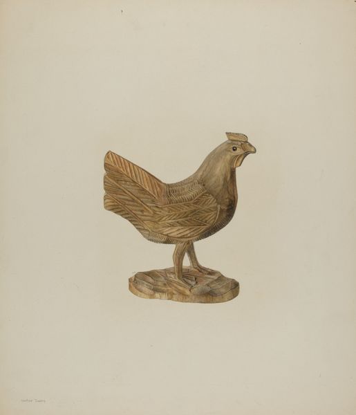 This lovely, if slightly austere, dove decoy was made by an anonymous artist, date unknown. I think about how an artist can take something functional, like a decoy, and imbue it with a kind of quiet presence. Look at the way the simple form is rendered with such care. The artist has used a limited palette of warm browns and tans, giving the dove a sense of earthy authenticity, and the surface has this lovely matte finish, almost like it's been rubbed down over time. And there's something so satisfying about the way the artist has suggested the texture of the feathers with these subtle, almost carved lines along the tail. It's this attention to detail, this commitment to the process, that elevates the decoy from mere object to something more akin to folk art. It reminds me a little of the work of Joseph Cornell, who was similarly interested in transforming the mundane into something magical.