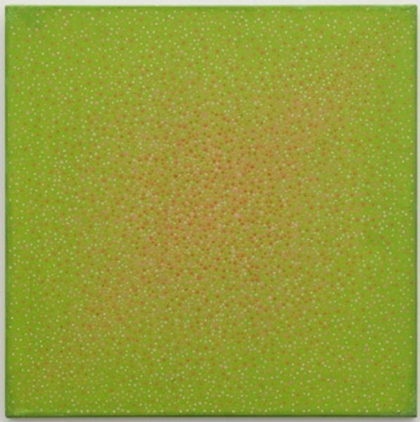 This untitled painting was made by Kuno Gonschior, and what strikes me is its obsessive mark-making. It's like Gonschior was thinking about the painting, one tiny dot at a time. You can see how each little dab of paint builds into something bigger. Up close, you'll notice the surface isn't smooth. There's a texture to it, a little bump from each dot of paint. It’s like the painting is breathing. In the lower left quadrant, where red dots meet that calming, fresh green, there’s a kind of vibration. It reminds me that color isn't just something we see; it's something we feel, too. Gonschior's work makes me think of Agnes Martin. Not that they look alike, but they share a dedication to simple forms and quiet gestures. Both invite us to slow down, to really see what's in front of us, and to let the painting do its work. The real point is the invitation to look slowly, and to feel fully.
