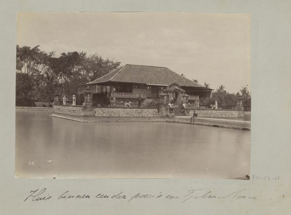 Curator: This photograph, titled "Gezicht op Taman Narmada," was taken by Christiaan Johan Neeb in 1894. What's your initial read on this vista? Editor: I find this serene. The tones create a soft, almost melancholic feel, even with the detail in the foliage. It's very picturesque in its composition. Curator: Indeed. The pictorialist style is quite apparent here, emphasizing atmospheric effects over sharp detail. Consider the tonal range: the darker, denser foliage creates contrast against the expanse of the reflecting water, focusing the eye on the tranquil expanse of water as a plane. Editor: The reflections definitely draw you in. Water often symbolizes purification and the subconscious. Considering "Taman Narmada" was once a royal pleasure garden, perhaps the artist intended to evoke those associations, linking pleasure and contemplation. Curator: Symbolism aside, let's look at the layout. The placement of the treeline on the rise cuts the picture in half with the lower segment mirroring this contrast of tone back up. What significance can we ascertain? Editor: Possibly a division between cultivated pleasure and the wild, natural world, or an explicit indication of the importance and separation between divine rulers and nature as a mirror. The lack of human presence makes nature itself the primary protagonist. What could it imply about our place within it? Curator: Intriguing notions. I am more drawn to the fact that this piece could indicate something further back given the photographer and subject. To that effect, there could be symbolic tension between nature and manmade constructions that will degrade or disappear, whereas Nature persists eternally. Editor: I like that thought, considering it would pre-date much colonial discourse regarding exploitation or extraction. A very peaceful memento mori. Overall, its subtlety provokes such reflection, doesn't it? Curator: Precisely. It shows that by attending closely to compositional and stylistic qualities, and then following it through a symbolic path, the picture's silent, subtle qualities provide a surprising wealth of interpretations and potential avenues.