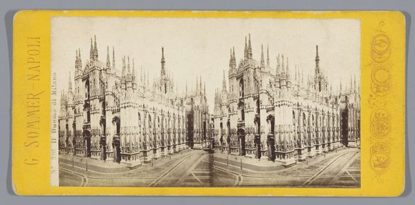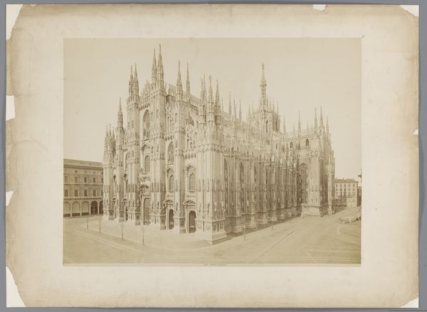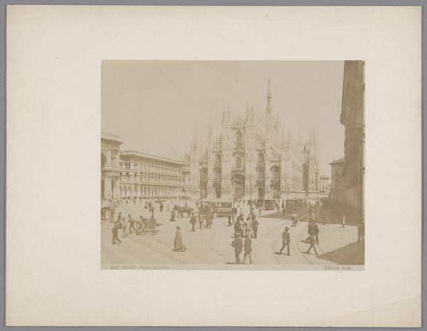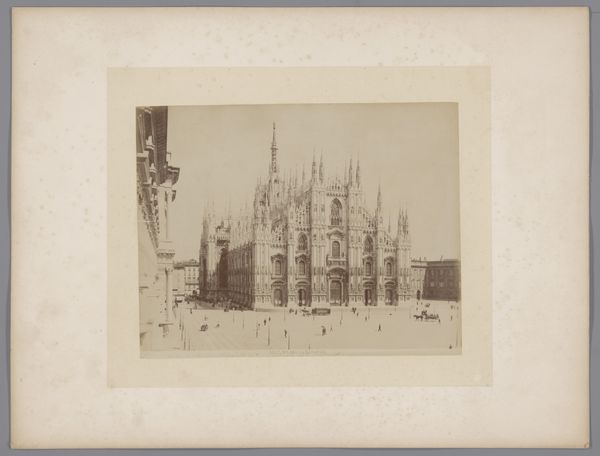 Editor: Here we have an interesting, sepia-toned image entitled "Gezicht op de kathedraal van Milaan, Italië," dating roughly between 1856 and 1881. It appears to be a photographic print, likely a daguerreotype, and shows a remarkably clear cityscape view dominated by the Milan Cathedral. Its gothic details stand out, especially against the bright sky! What do you make of this piece? Curator: This image offers a glimpse into the transformation of urban spaces through photography. Notice how the daguerreotype aesthetic lends a certain weightiness, an almost ancient feel, even to a structure built over centuries. How do you think this choice of medium affects our understanding of the cathedral? Editor: That's a great question. I suppose the daguerreotype gives it an air of historical permanence, more than if it were, say, a quick sketch or a modern photograph. It's presented almost as a historical document, an enduring symbol rather than just a building. Curator: Exactly. The photograph, circulated as a print, also becomes a tool for constructing a particular image of Milan, particularly within the context of 19th-century European tourism. Consider the small figures scattered in the foreground – they serve to emphasize the cathedral’s scale and grandeur, feeding into a narrative of awe and reverence for Italian history and culture. It speaks to the power dynamic between observer and observed. Do you agree? Editor: I do, and that's insightful! I hadn't really considered the angle of the observer shaping that narrative. It’s making me think more critically about whose story is being told through this seemingly objective depiction. Curator: Precisely. Even a photograph can be a loaded political statement. This has been interesting. Editor: It really has. Thank you for sharing this new perspective, considering the cultural and political undertones has given me much food for thought!