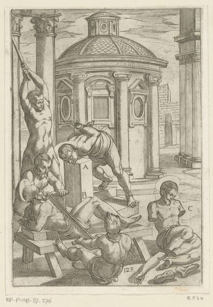 Editor: Here we have "Foltering met bijl en beitel," or "Torture with Axe and Chisel," an engraving made sometime between 1565 and 1630 by Antonio Tempesta. It's pretty gruesome, even considering its age. The composition is stark and unsettling. What historical context informs such a brutal image? Curator: The image aligns with a period of intense religious and political upheaval. These kinds of images served very specific purposes. Consider the role printmaking played in disseminating political ideologies and religious propaganda. Who was the target audience for a print like this, and what message might it convey? Editor: I suppose the vivid depiction of torture would serve to instill fear and obedience, maybe discourage dissent, or solidify the authority of whoever's ordering the torture? But why disseminate it so widely? Curator: Exactly. The Baroque era witnessed the rise of powerful states consolidating control, often through violent means. The print's distribution fostered a culture where the spectacle of violence became normalized, even serving as a warning. It reminds viewers of the consequences of transgression against established authority, be it religious or secular. Editor: It's horrifying to think that art could be used in that way, to normalize cruelty... Were there counter-narratives in art at the time? Curator: Certainly, although access to those alternative perspectives may have been restricted for some. Artists affiliated with groups experiencing persecution often subtly incorporated dissenting messages or depicted resistance, contributing to the public's collective consciousness, challenging the dominant narrative through veiled symbolism or coded imagery. It all was about access and circulation. Editor: Wow, that completely changes how I see the role of this artwork, not just a historical record but an active player in the power dynamics of the time. I didn't think about prints as being such powerful tools of communication. Curator: Precisely. It forces us to critically examine not only what art depicts but also its socio-political role and intended audience.