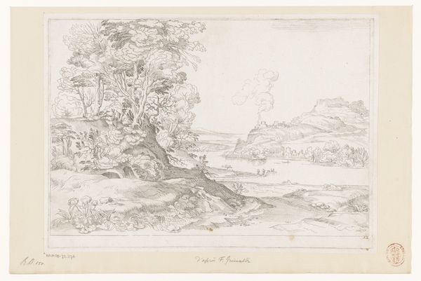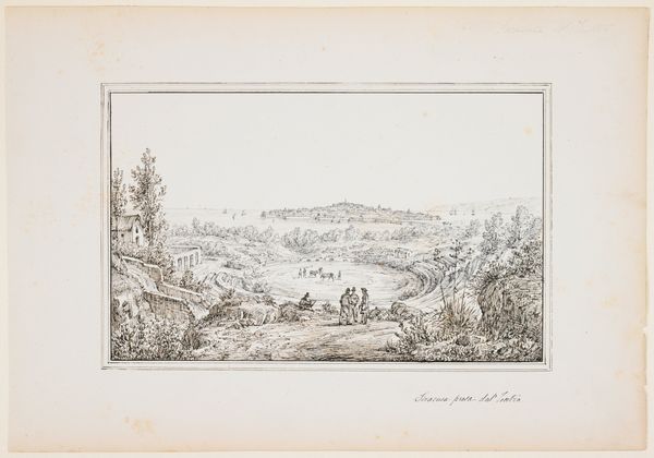 Editor: Here we have "View of Capri from Anacapri," a 19th-century etching on toned paper by Antonio Senape, currently residing at the Minneapolis Institute of Art. The delicate lines give it a serene, almost dreamlike quality, wouldn't you agree? What symbols or narratives jump out at you? Curator: It's interesting that you call it dreamlike. Indeed, it is, particularly when viewed through the lens of Neoclassicism, which was very interested in recreating “ideal” and often melancholic landscapes, like Arcadia. The image teems with classical tropes, like the distant ruins. Editor: Oh, I see what you mean. The little figures almost look like philosophers on a promenade. Curator: Precisely! Notice their attire, slightly antiquated, echoing earlier eras. It subtly prompts viewers to locate themselves within the continuous thread of history. And how about the inclusion of ancient architecture and nature? Editor: It's a stark contrast, nature feels immutable, while human structure crumble with the passage of time. Curator: Exactly. Senape plays with our perception of time, layering eras within one view, suggesting cultural memory isn't linear but an accumulation. Think about how a view evokes a psychological state for the viewer: what message does this view of Capri want to instill within the viewer? Editor: That makes me think about how travel was seen then – as an almost scholarly pursuit. Curator: Indeed. It’s more than just a picturesque scene; it’s a meditation on history, the passage of time, and our place within that grand narrative. What's most fascinating to me is the psychological weight placed on a location through artistic representation. Editor: This has given me a totally new perspective. Thank you! Curator: My pleasure! It's about looking beyond the surface and seeing how artists imbue places with layers of meaning that resonate even today.