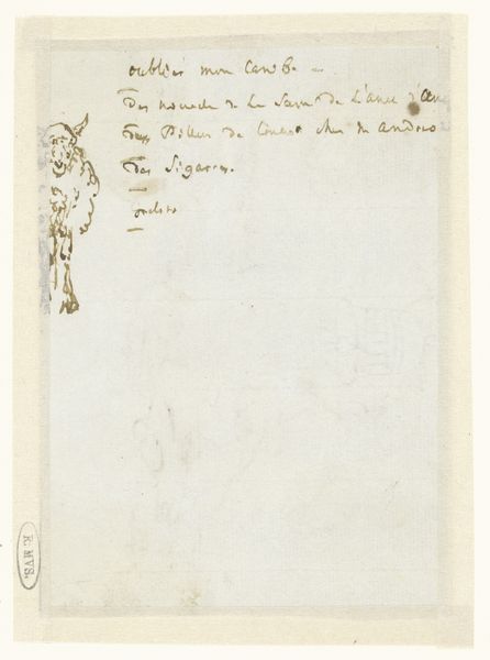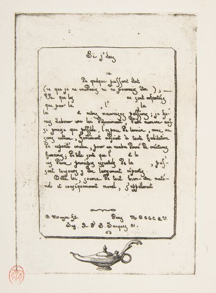 Curator: Oh, isn’t this intriguing! Take a moment with Charles Meryon’s etching from 1854, “Let the pure soul groan…” Currently held at The Art Institute of Chicago. It’s, well, it's basically a handwritten text, isn't it? Editor: Immediately, it feels incredibly claustrophobic. It’s monochrome, primarily text…like peering into someone’s frantic, perhaps unstable mind. Curator: Meryon was known for his depictions of a rapidly changing Paris, his fascination with its architecture, and the way those very stones seemed to embody human emotions. Here, he moves inward and offers words... seemingly a fragment of poetry. Editor: Paris as an emotional landscape— I'm so interested in this framing of architecture as emotional scaffolding. But also, let’s consider the date: 1854. Urban renewal, displacement, Haussmann's plan was fundamentally reshaping lives and social fabrics. "Let the pure soul groan…" becomes less about personal anguish and more about communal despair. The choice to use handwriting connects to an embodied presence too: who’s voice is this? Curator: I always felt his choices reflected his internal landscape... particularly as his mental health deteriorated. I mean look how cramped those letters are, practically tripping over one another, it does create a certain unease. You've noticed the dark language— references to demons and diabolical forces intertwined with this description of "our good city." Meryon is suggesting this corruption runs deep within even familiar settings. Editor: Or is it the city itself which corrupts? Notice also, that it could easily read like some incantation, some forbidden script. The role of the written word itself is so powerful. Is Meryon acting as chronicler, a visionary, or an exorcist here, wrestling with the spirits of urban life? It calls on very relevant modern concepts such as “gentrification” and the cleansing of community. Curator: Ultimately, I'm left with a sense of human vulnerability against the backdrop of forces much larger than ourselves, urban and personal both. Editor: Indeed, and how our environments, our very built environments, continue to haunt us, demanding we grapple with the legacies they embody. It's a fitting prompt for further reflection.