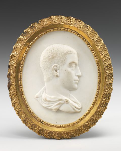 This is Josiah Wedgwood's "Titus," a stoneware portrait medallion made in the 18th century and held at the Metropolitan Museum of Art. Its monochrome palette and meticulous detail draw us into the world of Neoclassical portraiture. Wedgwood, celebrated for his innovative use of materials, plays with relief here. The matte black stoneware creates a tactile surface, with a slightly raised profile of Titus in stark contrast to the flat background. Look at how light interacts with the subtle gradations of texture to define Titus's features. The oval form containing the portrait, along with the classical subject, evokes a sense of historical continuity and authority, characteristic of the Neoclassical movement. The crisp lines and simplified forms reflect a desire to return to the perceived purity and order of ancient art. In its restrained elegance, the medallion speaks to a broader philosophical interest in ideas of virtue, reason, and civic duty that prevailed during the Enlightenment. Consider the subtle, almost muted quality of the piece, and how it invites quiet contemplation. Its form and materials engage with larger dialogues about history, value, and the nature of representation itself.