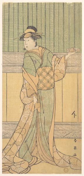 Editor: This woodblock print, "The Actor Iwai Hanshiro IV as Umegae…," dates from around 1781 and is by Katsukawa Shunko. The flat colors are so interesting, and I am curious to learn more about what influenced their use and application here. What stands out to you about this artwork? Curator: I am drawn to the processes inherent in Ukiyo-e prints like this. The registration marks, visible upon close inspection, speak to the labor involved and the collaboration between artist, block cutter, and printer. Each impression bears the marks of its making, a tangible record of collective production and distribution. How was art democratized via the technical ingenuity evident here? Editor: Democratized? Could you explain what you mean by that? Curator: Certainly. Ukiyo-e prints made art more accessible, breaking down the barriers between the elite and the everyday consumer. The materiality of the print – the paper, ink, and wood – all contribute to understanding how these images were circulated and consumed. Editor: That makes a lot of sense, seeing how affordable prints could become... I never thought about it that way. So much about the piece can be revealed through understanding production. Curator: Precisely. Also consider how it blurs the lines between “high” art and commodity, questioning the role of artistic skill and manual labor. Consider it – the materiality challenges us to re-evaluate traditional hierarchies within the art world. Editor: Thinking about the historical context helps me appreciate all the different levels on which this portrait can be appreciated. Thank you for helping me better appreciate the materiality!