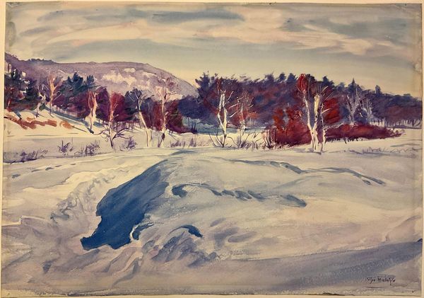 Editor: Dodge Macknight's watercolor, "New England Hillside, Winter, Gorham, New Hampshire," depicts a snowy landscape with vibrant colors. The scene feels both serene and alive. What symbols or meanings do you find present in this work? Curator: The snow, often associated with purity and stillness, is subverted here. Macknight's use of blues and violets in the shadows suggests a hidden energy, a memory of warmer seasons beneath the surface. The trees, especially the evergreens, represent resilience and eternal life, standing firm against the winter's harshness. Editor: So, despite the winter setting, the painting evokes a sense of ongoing life and latent energy? Curator: Precisely. Macknight uses familiar winter imagery, but infuses it with a vibrant palette, reminding us that even in the depths of winter, life persists and renewal awaits. Editor: That's a perspective I hadn't considered. It enriches my understanding of the artwork. Curator: Indeed. The symbols speak not just of winter's stillness, but of the enduring spirit of nature.