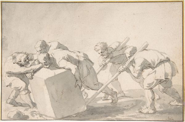 Curator: Here we have “Kneeling Saints Nicholas and Dominic with the Virgin Ascending into Heaven,” a drawing executed in ink on paper by Giovanni Battista Tiepolo sometime between 1706 and 1770. Editor: Immediately, I’m struck by its lightness. It's airy and ethereal. You know, the way the figures seem to almost float—it feels more like a fleeting vision than a concrete scene. Curator: The composition employs a clear hierarchy, wouldn't you agree? The Virgin Mary’s upward movement contrasts against the kneeling postures of Saints Nicholas and Dominic, thereby establishing her elevated spiritual status. The artist is using formal techniques to construct a powerful narrative. Editor: I see what you mean, but the drawing’s loose, sketch-like quality also gives it a raw emotional immediacy, wouldn't you agree? Like we're peeking into Tiepolo’s creative process. Also the way he uses line to create such drama and movement from a quiet image on a page. It’s like the clouds themselves are alive and lifting Mary heavenward. Curator: Precisely, and note how the carefully chosen sepia tones not only contribute to the somber subject matter but also direct the viewer's gaze through nuanced gradations of light and shadow. We could use semiotics to delve further into how color functions as an important element in creating meaning here. Editor: Absolutely, and what a concept: two rather different monks witness Mary's ascent together. Maybe it implies the importance of unity between varying interpretations of faith. Maybe Tiepolo included glasses sitting atop of books to represent scholarship and the importance of perspective. I wonder… Curator: Indeed. It is in this dialectic between careful artistic structuring and deeply human experience that Tiepolo invites us to delve deeper, not merely into religious iconography, but into fundamental considerations on human perception and emotion. Editor: Well said! What began for me as a fleeting glimpse now feels rich with history, interpretation, and yes, Tiepolo’s enduring mastery.
