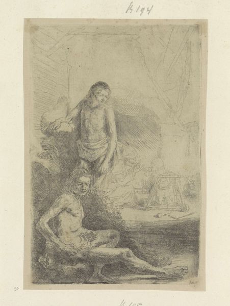 Rembrandt van Rijn made this etching, ‘Studies from the nude: one man seated and another standing: with a woman and baby lightly etched in the background’, in the 17th century. The Dutch Golden Age, marked by the rise of a wealthy merchant class, shifted patronage from the church to individual citizens. Rembrandt, who was keenly interested in the everyday, responded with genre scenes and portraits, often turning to his own life and surroundings. This piece provides a window into Rembrandt’s world, a space for exploring the bodies and lives of those around him. Although the male nude dominated academic art, Rembrandt’s inclusion of a woman and child hints at an intimacy and domesticity rarely depicted at the time. It acknowledges the labor and presence of women within the domestic sphere. Here, the artist studies the body, depicting a seated man with a quiet vulnerability as he seems to adjust his clothing, while the others linger as ghostly images in the background. It’s this personal touch, the delicate rendering of the human form and the quiet exploration of identity that makes this etching so compelling.